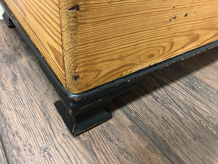 The base of the trunk was covered in grasscloth and had wooden decorative trim. The grasscloth was missing in a few places and had been well-loved by the family that owned it.