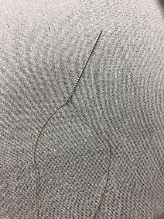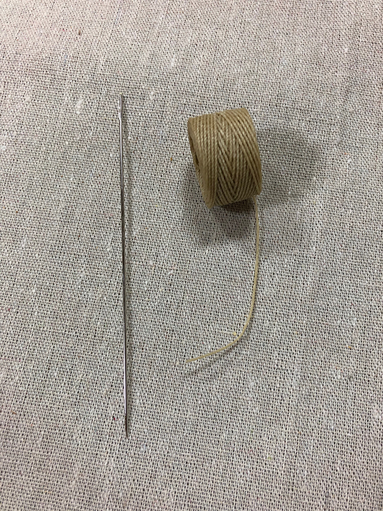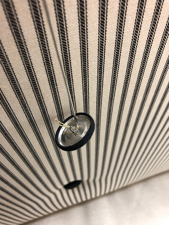 Tufting requires some preplanning. Mark each spot to be tufted on the wooden lid prior to upholstering. Drill two small pinholes in the wood at each tufting spot. You will need waxed upholstery thread and an upholstery needle. Thread a piece of waxed thread onto the needle. Feed the needle through the wood on the bottom and pierce the fabric. Thread the button and pierce the fabric again finding the second hole in the bottom of the wood. Pull tightly and tie off the thread with multiple knots. Trim the remaining thread. The slideshow below illustrates the steps.