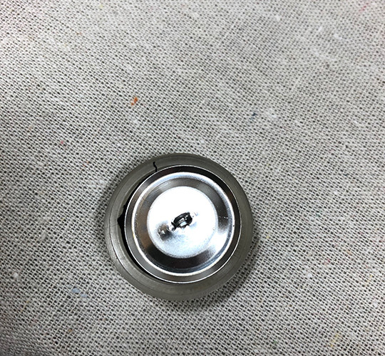 This slideshow illustrates putting the fabric and the top of the button in the button mold, gathering the fabric and pushing it inside the button and placing the back of the button on the mold. Then use the blue pusher to press the back into the button securing the fabric inside the button.